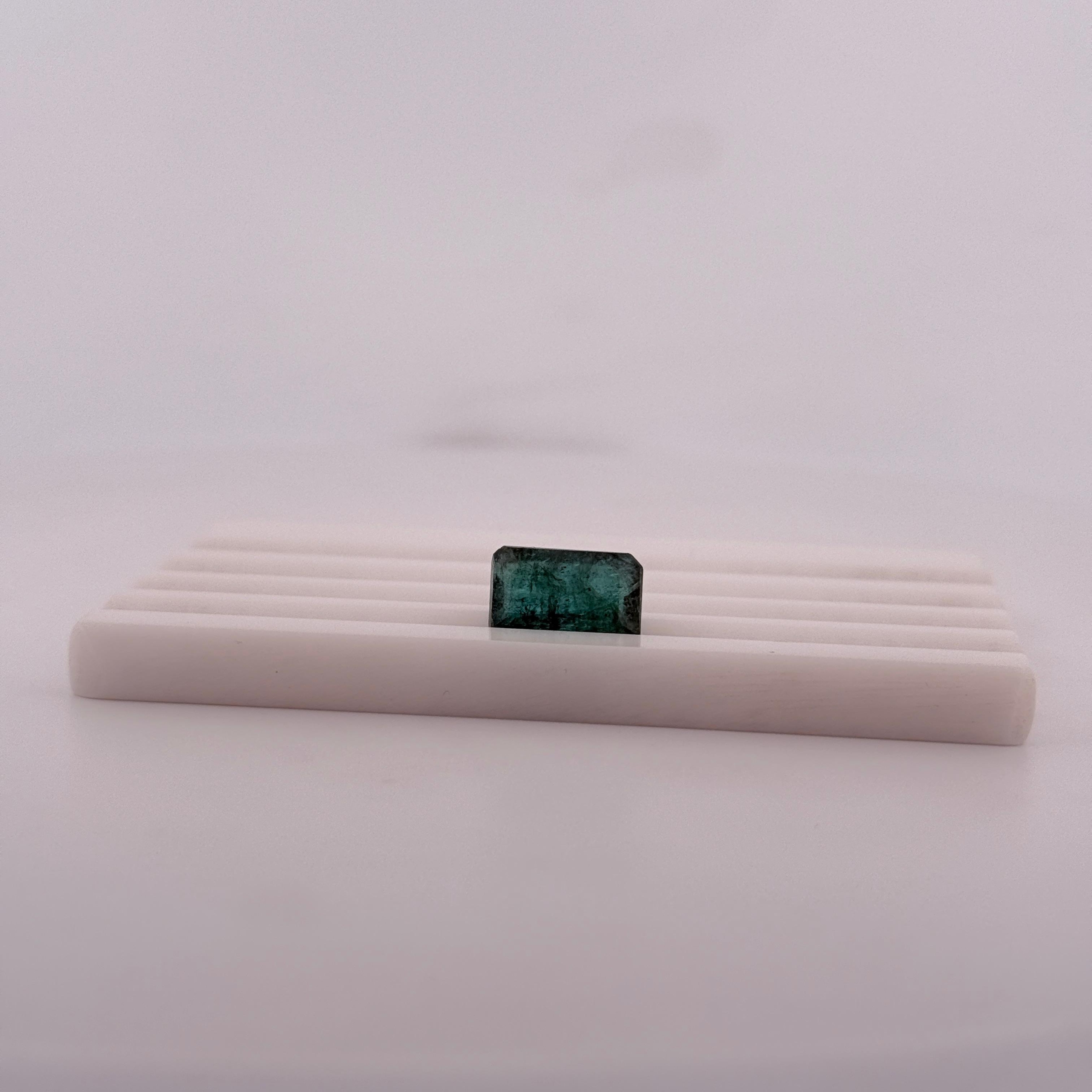 Its rectangular emerald cut enhances symmetry and color concentration, giving the gemstone a structured and refined appearance. The step-cut facets allow light to reflect in a clean, sophisticated manner, emphasizing its depth and richness rather than surface sparkle — a hallmark of high-quality emeralds.